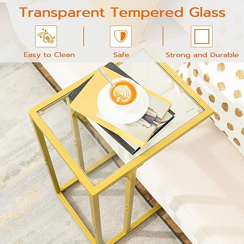 HOOBRO Table d'appoint en Forme de C, Table d'appoint en Verre trempé avec Cadre en métal, pour Petit Espace, canapé et lit, Style Moderne, doré EGD03SF01G1