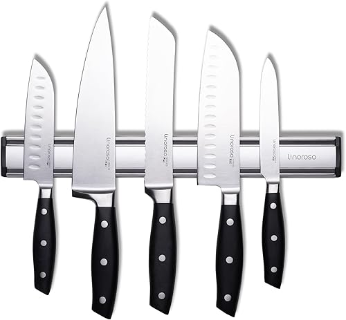 Linoroso Lot de 5 couteaux de cuisine avec support magnétique mural - Ensemble de couteaux de cuisine en acier inoxydable hautement allié : couteau de chef, couteau Santoku, couteau à pain, couteau