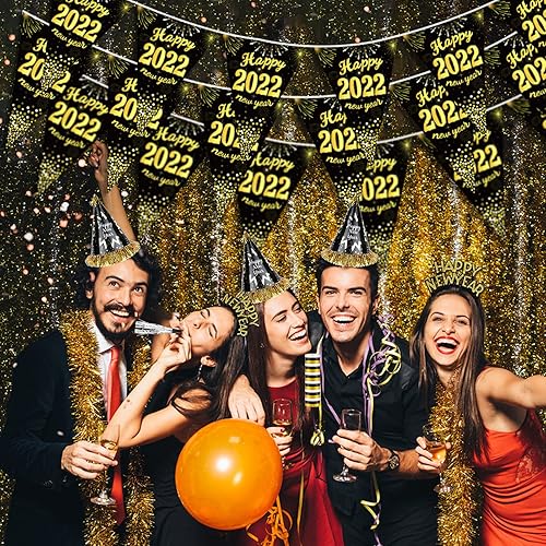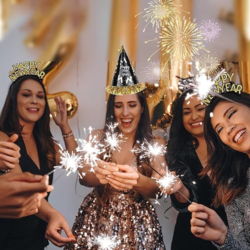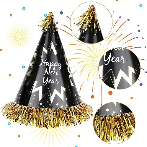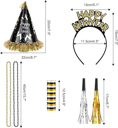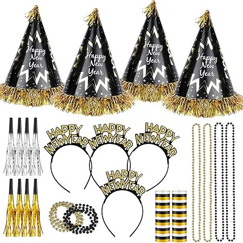 HOWAF 26 Pièces Bonne Année 2025 Nouvel an fête Fournitures Kit de Décorations, Noir Or Happy New Year Chapeaux de Cône Bandeau Cornes Sifflet Colliers, Photobooth pour Fête du Nouvel an Fournitures