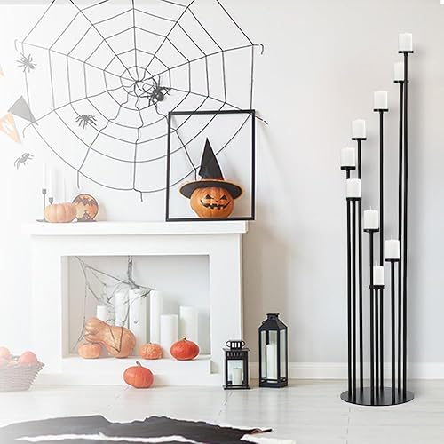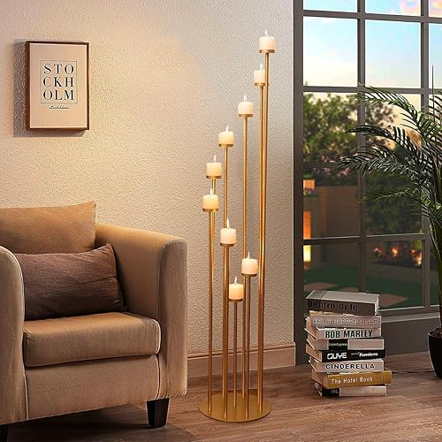 Fullvaseer Chandelier doré à 9 branches, à poser au sol, en métal pour bougies piliers, Noël, mariage, maison, Halloween, décoration de fête (117,6 cm)