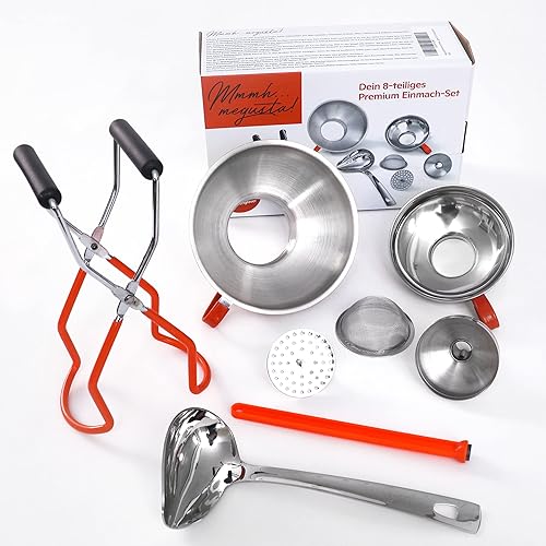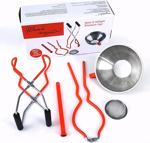 megusta!® Set de mise en conserve 5 pièces | entonnoir acier inoxydable | tamis fin | pince bocal | pince pour ouvrir | aimant pour le couvercle | + etiquettes