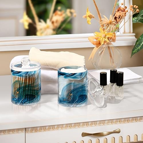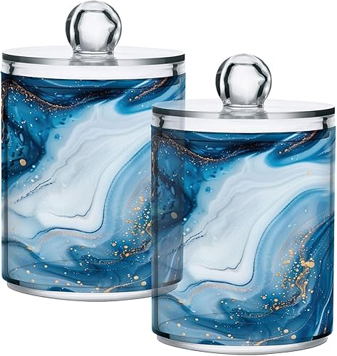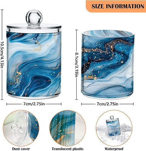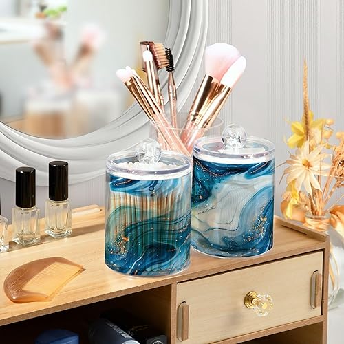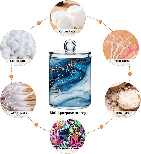 Sevdomey Lot de 2 pots d'apothicaire en plastique transparent avec couvercle pour boules de coton, cotons-tiges, tampons ronds et fil dentaire Bleu et blanc