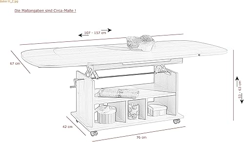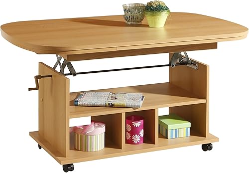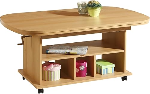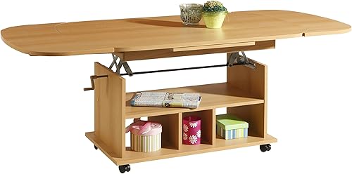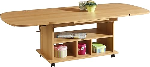 Hela Tische, Table Basse Fonctionnelle Babsi, en matériau dérivé du Bois avec revêtement en mélamine, hêtre, réglable en Hauteur de 53 à 63 cm, Extensible de 107 à 157 cm, sur roulettes
