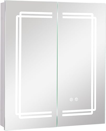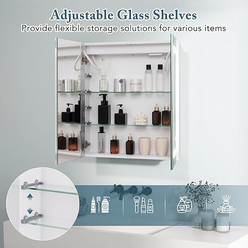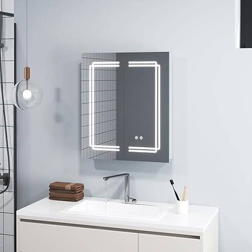 GIANTEX Armoire à Miroir de Salle de Bain avec Éclairage, Meuble Salle de Bain avec 3 Étagères Hauteur Réglable, 3 Couleurs LED, 2 Portes, Interrupteur Tactile, Désembuage, 60 X 70 X 13 CM, Blanc