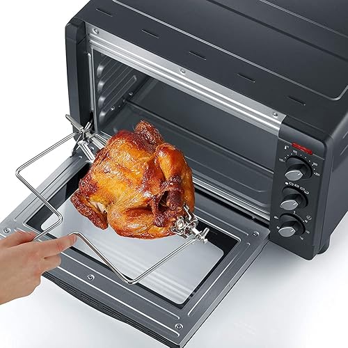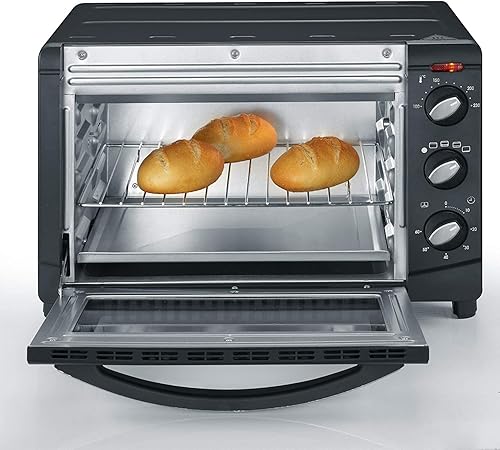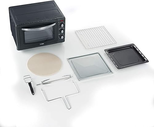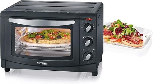 SEVERIN Mini-Four à Chaleur Tournante 20 L, Inclus : Tournebroche et Pierre à Pizza (Ø 29cm), Minuteur 60 min, 1 500 W, Noir/Inox, TO 2061