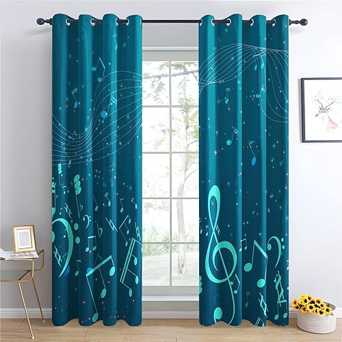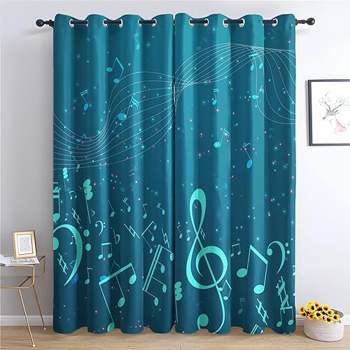 Rideau Occultant Note de Musique Turquoise - Lot de 2 Rideaux Thermiques Isolants Anti Froid Imprimé pour Salon Chambre Fenetre, Rideaux et Draperies Intérieurs à Oeillets, 140x160 cm (LxH)