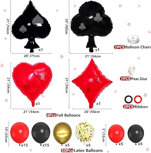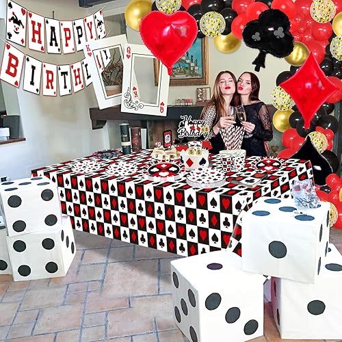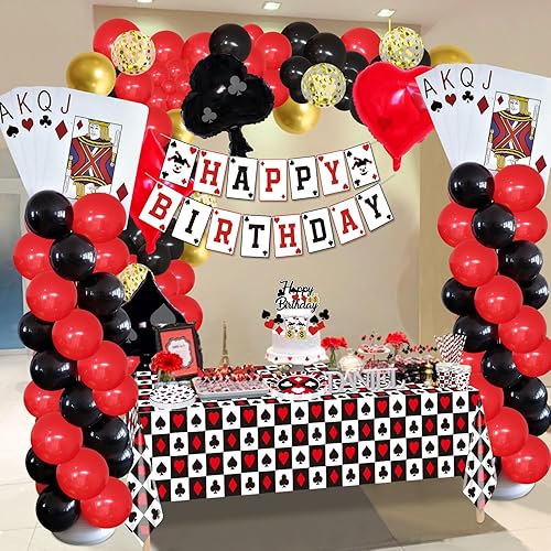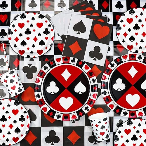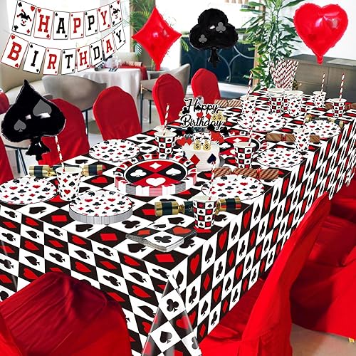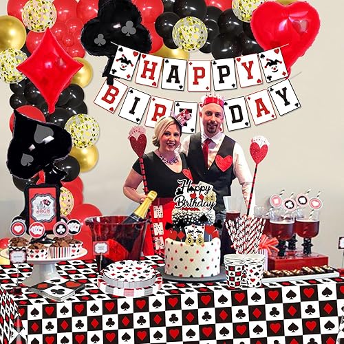 Lot de 173 décorations d'anniversaire de casino – Assiettes de poker, serviettes, tasses, ballons, bannière d'anniversaire, décoration de gâteau et nappe pour fournitures de fête sur le thème du