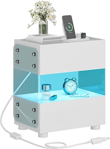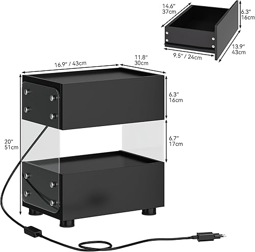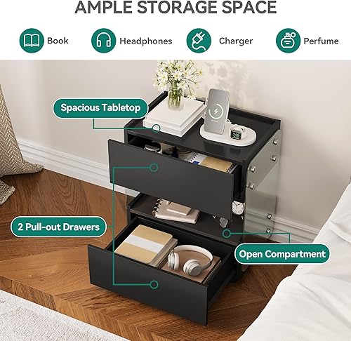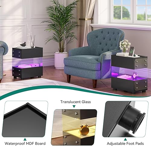 YITAHOME Table de Chevet Flottante à 2 Tiroirs avec Barre Lumineuse LED 7 Couleurs, Table d'Appoint Moderne avec Verre Trempé Dépoli pour Chambre à Coucher, Salon, Noir