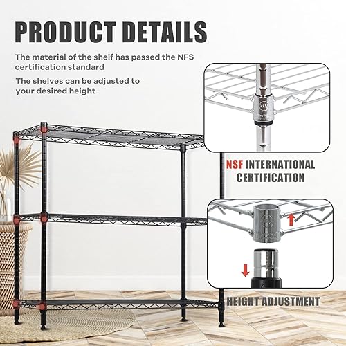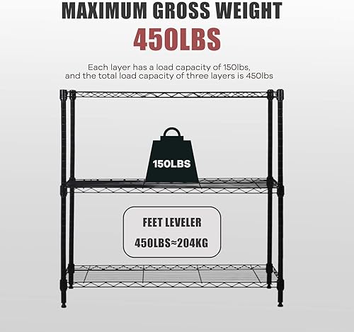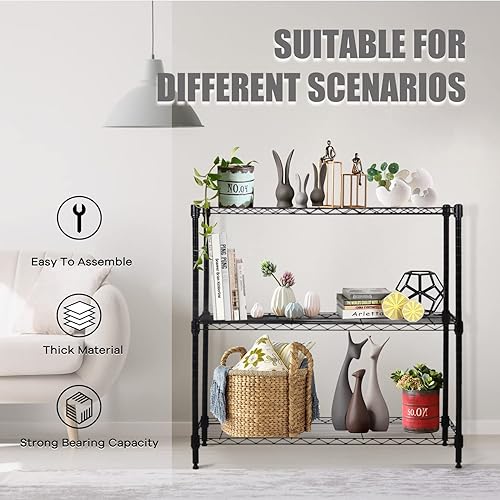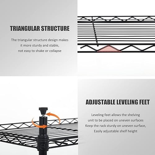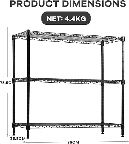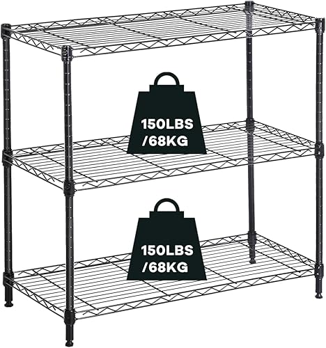 Actask Etagere Rangement à 3 Niveaux, Étagère de Rangement avec Étagères en Fil d'acier Réglables en Hauteur et Pieds de Nivellement pour Cuisine Garage Salon Chambre - Poids Maximal de 204KG, Noir