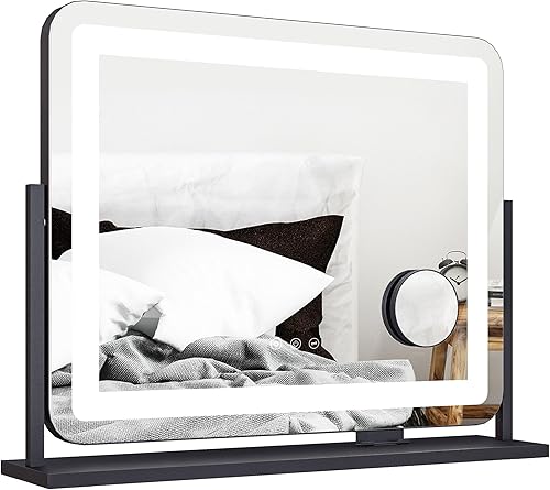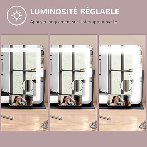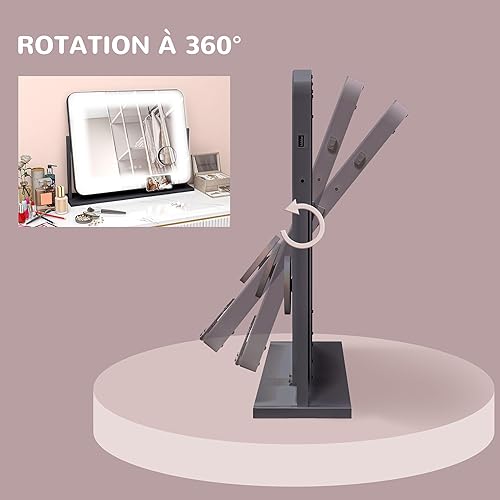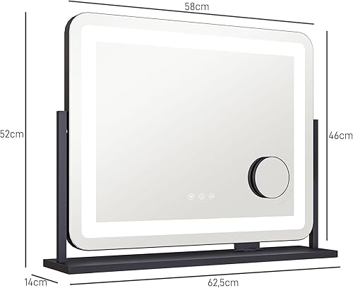 HOMCOM Miroir Lumineux LED intensité Miroir de Maquillage 3 Modes d'éclairage grossissement 10X, Port de Charge USB, Touche Tactile, Rotation à 360° - 62,5 x 52 cm
