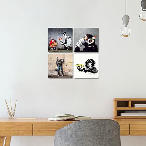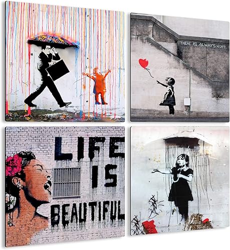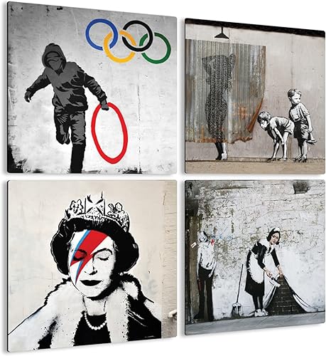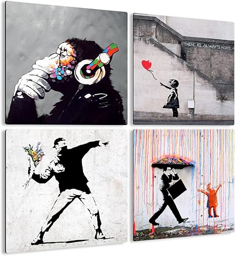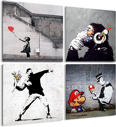 Giallobus - 4 carrés Multi-Panneaux - Banksy - Les Plus Belles œuvres de Banksy - Collection 1 - Bois MDF - 29,7x29,7 - x 4 pièces