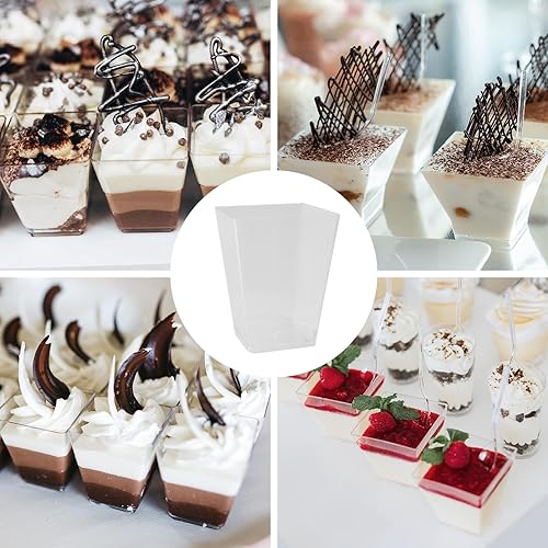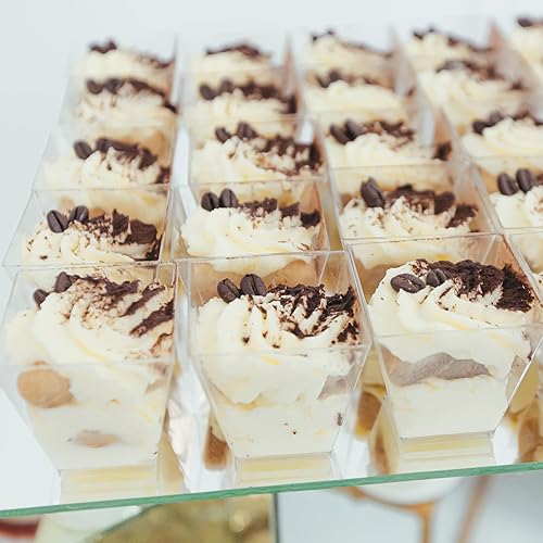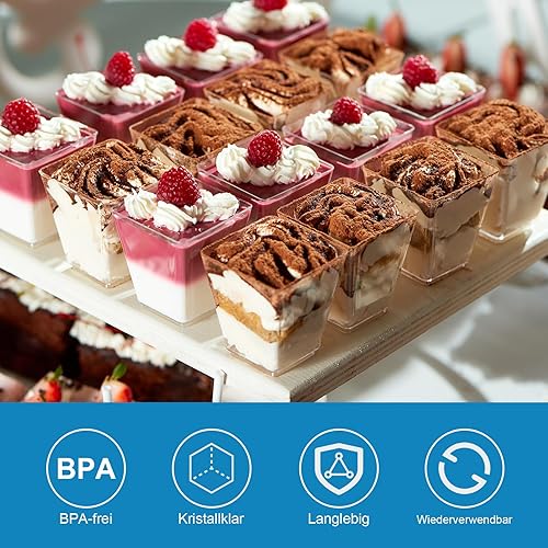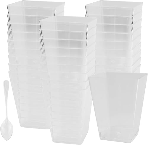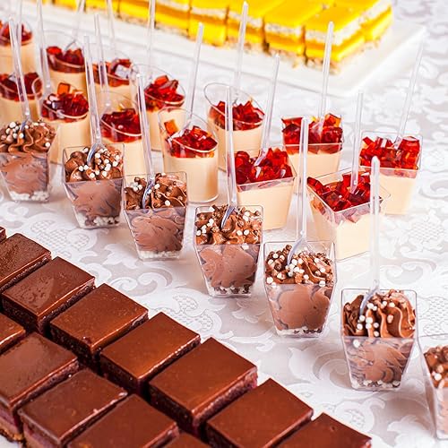 EASYKEENECOM Lot de 25 Verres à Dessert en Plastique 160 ml – Avec Cuillères – Réutilisables coupes à dessert, Rectangulaires verrine dessert – Idéals pour Desserts, Pudding, Mousse, Glace
