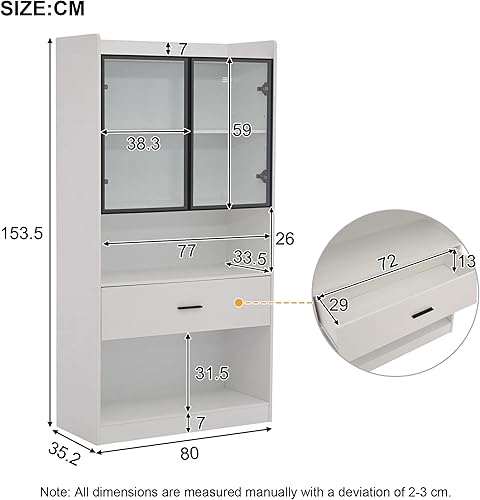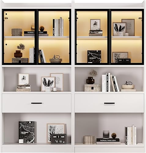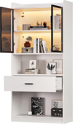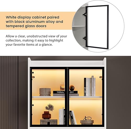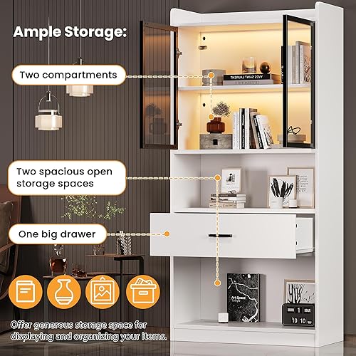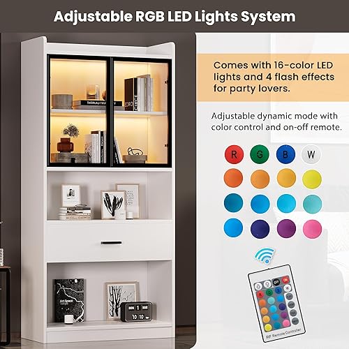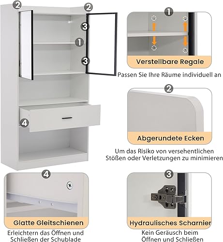 Vitrine avec éclairage LED - Armoire en verre avec 2 portes et 1 tiroir - Armoire de rangement pour salon, bureau, salle à manger - Blanc