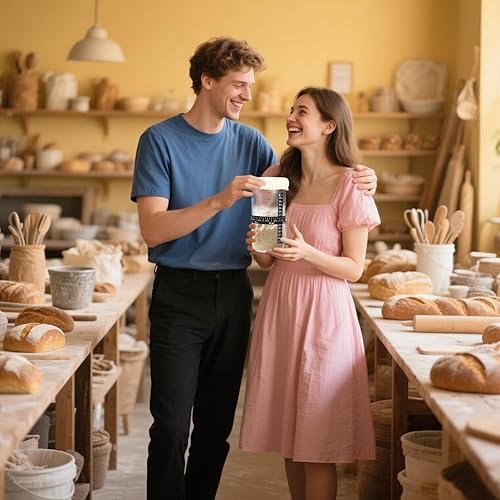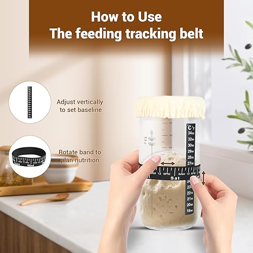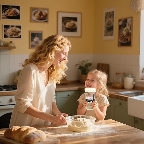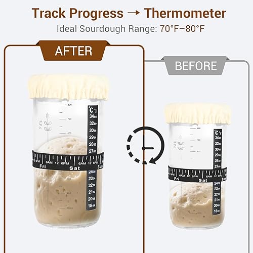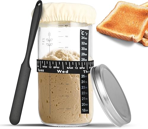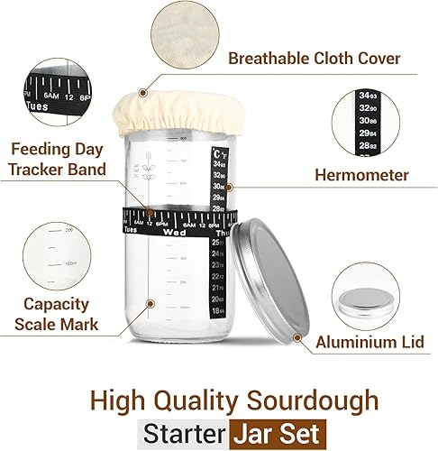Atliberswo Pot de levain 35 oz/1000 ml, Kit de démarrage – Pot de fermentation avec thermomètre, spatule en silicone, couvercle en aluminium & ruban d'alimentation réutilisable