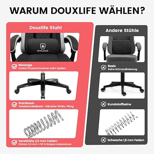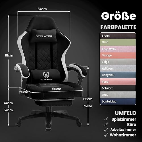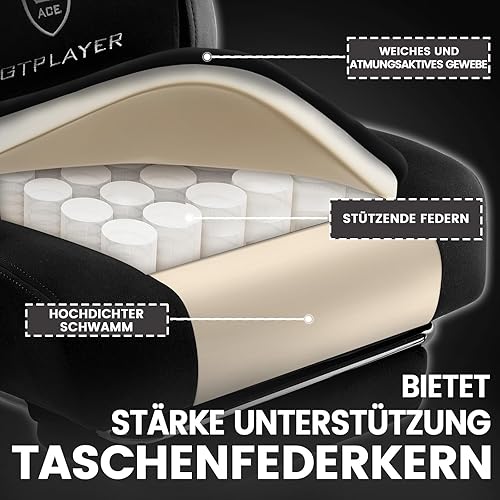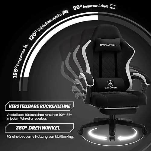 GTPLAYER Chaise de Gaming Ergonomique avec Surface en Tissu, Coussin de siège à Ressort, accoudoirs de Connexion et Repose-Pieds Noir foncé