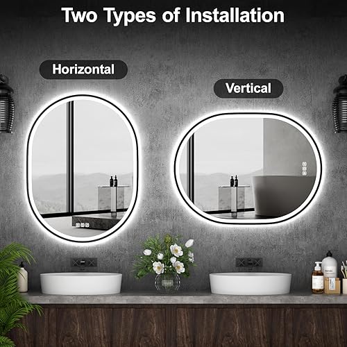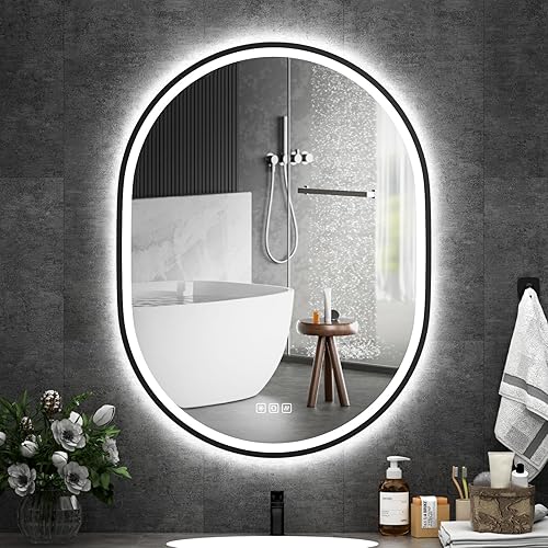 furduzz Miroir de salle de bain ovale à LED 900 x 700 mm avec cadre noir, miroir de courtoisie mural avec anti-buée, 3 couleurs, mémoire, intensité variable, horizontal/vertical