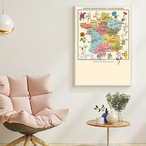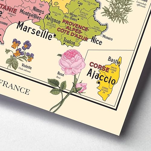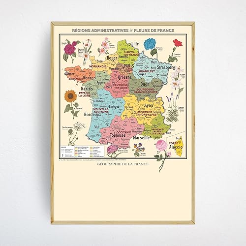 Carte de France Vintage - Régions administratives et fleurs de France - Affiche A1 (livrée pliée)
