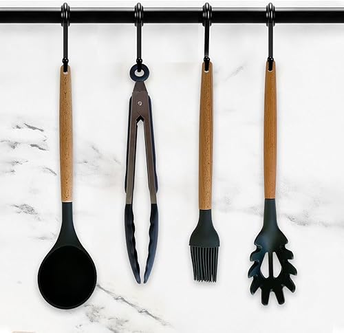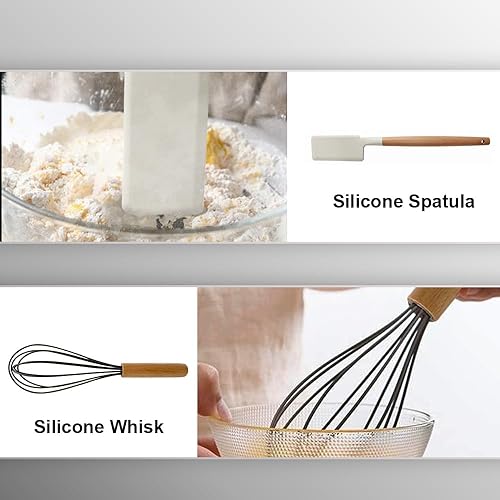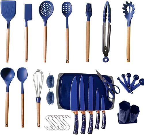 Lot de 31 ustensiles de cuisine résistants à la chaleur avec poignée en bois en silicone avec support, spatule, cuillères, tourneur, pinces, couteaux, gadgets de cuisine antiadhésifs