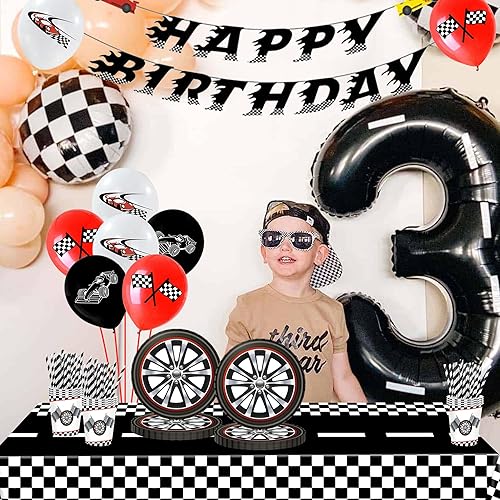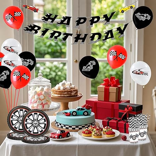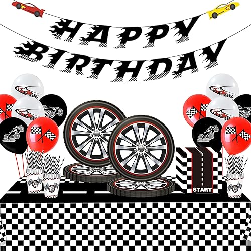 Kit de vaisselle de fête d'anniversaire pour garçon - Voiture de course - Ballons Happy Birthday - Bannière d'anniversaire d'enfant - Avec voitures, assiettes en carton, gobelets, serviettes, pailles