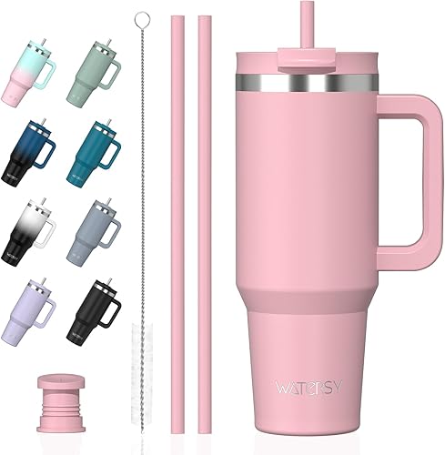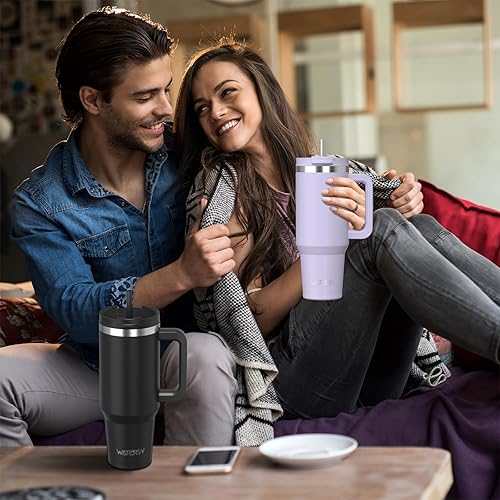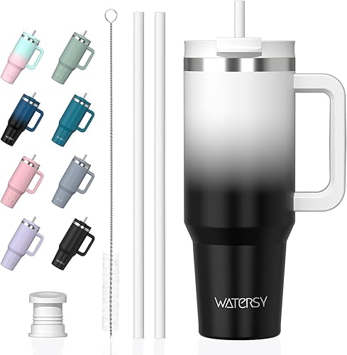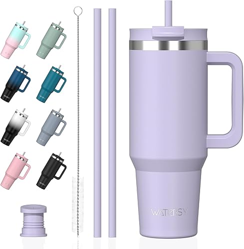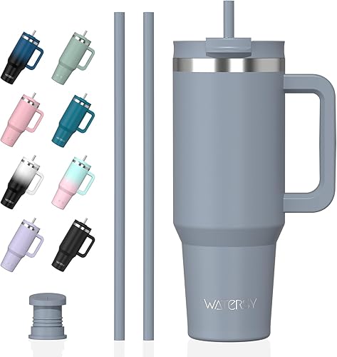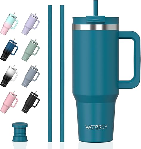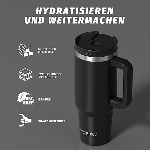 WATERSY Gourde Isotherme 1,2 L avec 2 Pailles, Gobelet à Café anti-Fuite, Isotherme Sous vide avec Couvercle à vis sans BPA, Gourde Rafraîchissante Pendant 12 Heures, Bleu marine