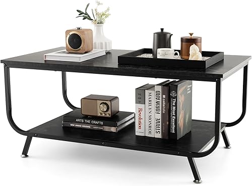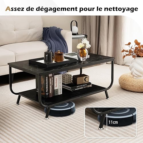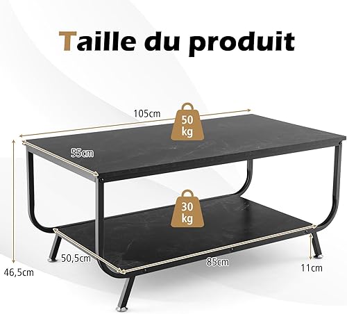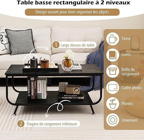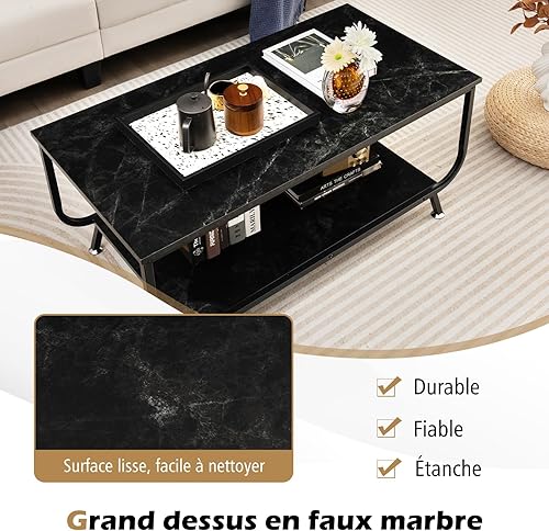 COSTWAY Table Basse Salon Double Plateau Effet Marbre, Table Salon Rectangulaire Moderne, Cadre en Métal, 105 x 55 x 46,5 cm (Blanc doré)