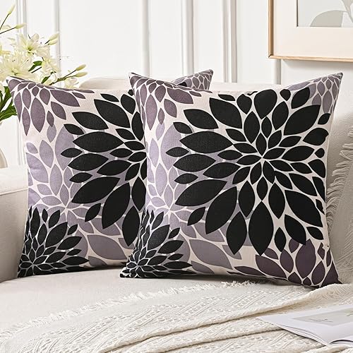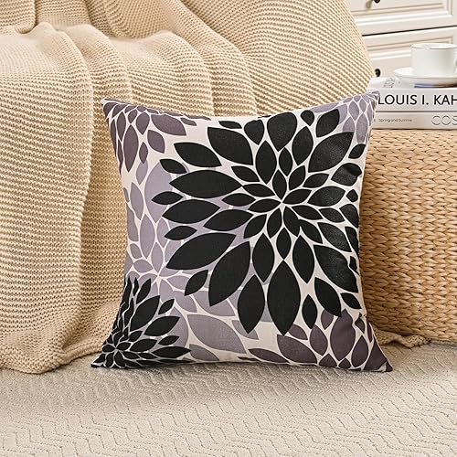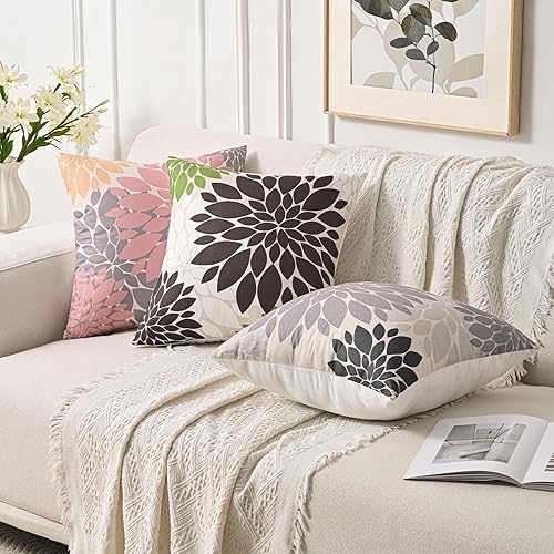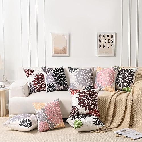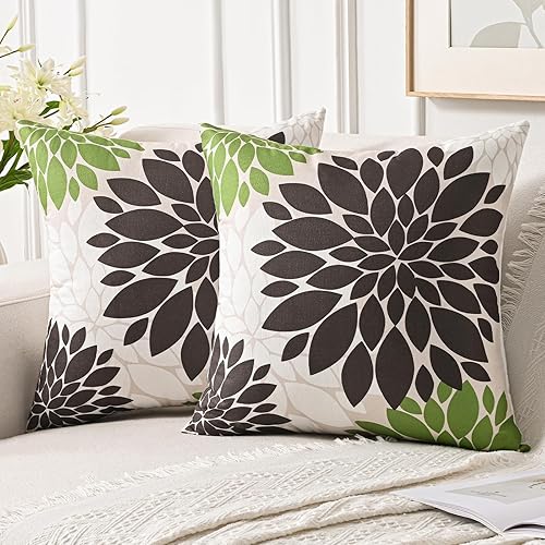 Jayusaror Housse de Coussin 40x40 cm Lot de 2 Decoratif Automne d'hiver Motif Canape Brun et Vert Fleurs de Dahlia Taie d'oreiller en Lin pour Chambre, Canapé, Chaise, Lit, Jardin Printemps Été