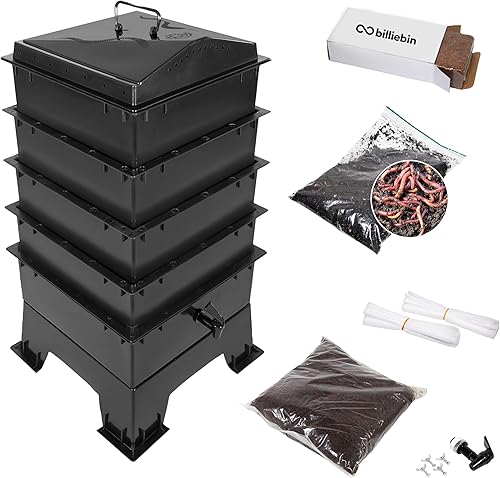 Billiebin | Lombricomposteur 4 Plateaux Kit Complet | 150gr de vers de Compost | Substrat de démarrage + Bloc de Coco + Accessoires | Intérieur, Balcon et Jardin (Noir)
