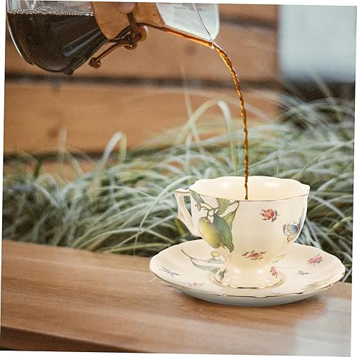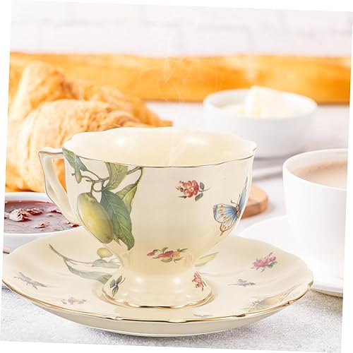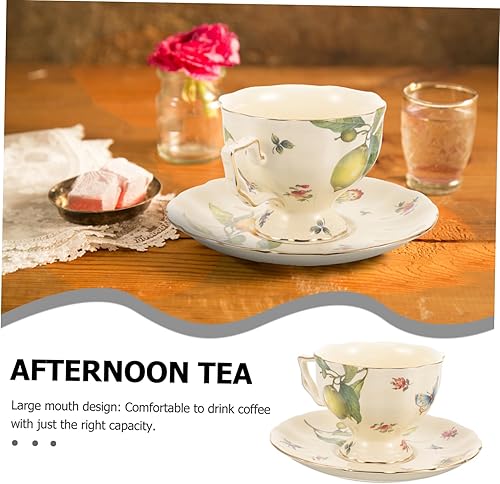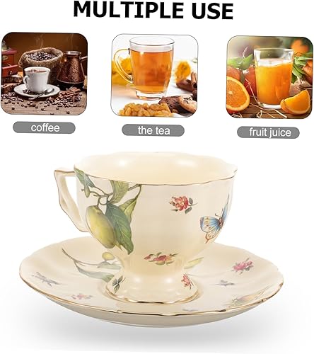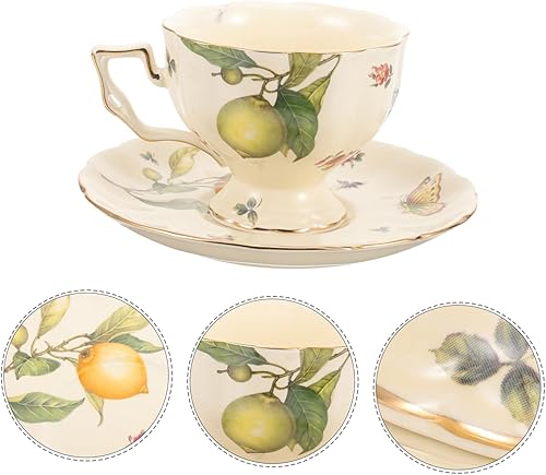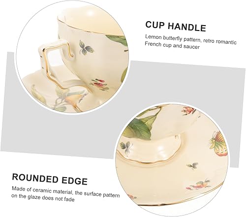 Mobestech 1ensemble Tasses À Café Céramique avec Soucoupes Tasses À Latte Vintage Motif Citron Et Fleurs Thé Après-midi Français Et Anglais Mug Confortable Et Résistant