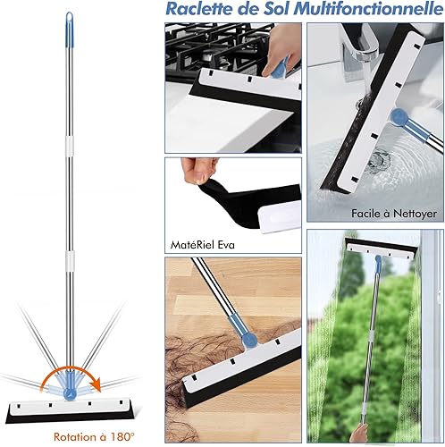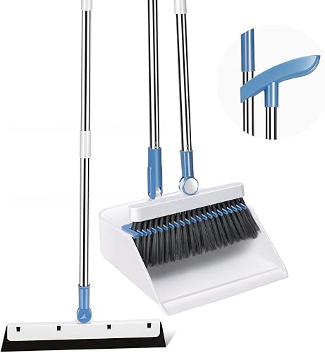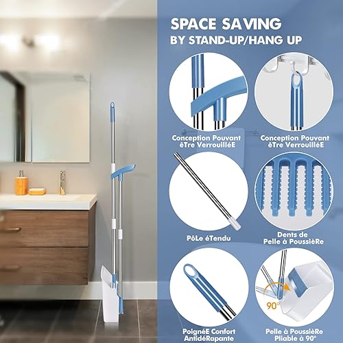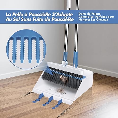 Myiosus Pelle Balayette Manche Long, Balai et Pelle Ensemble, Rotatif à 180 Degrés de Balais Nettoyer Sol, Balai Pelle sans se Baisser pour Extérieur, Jardin, Hall, Intérieur (Blanc)