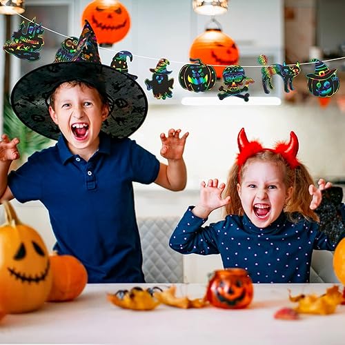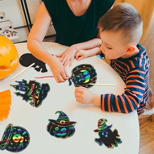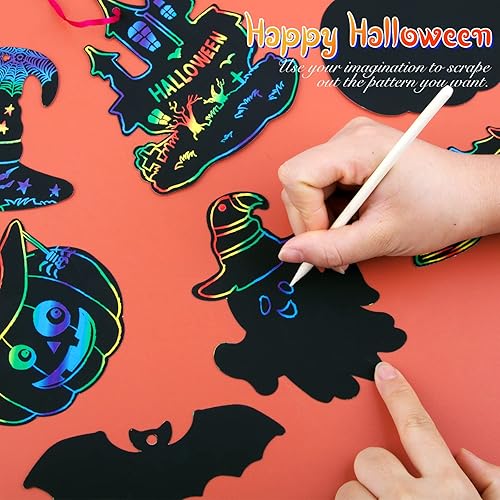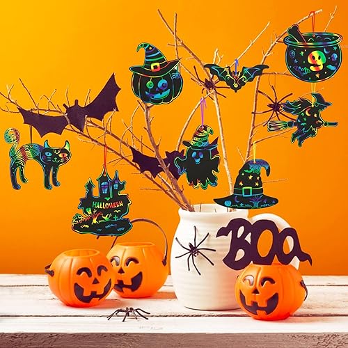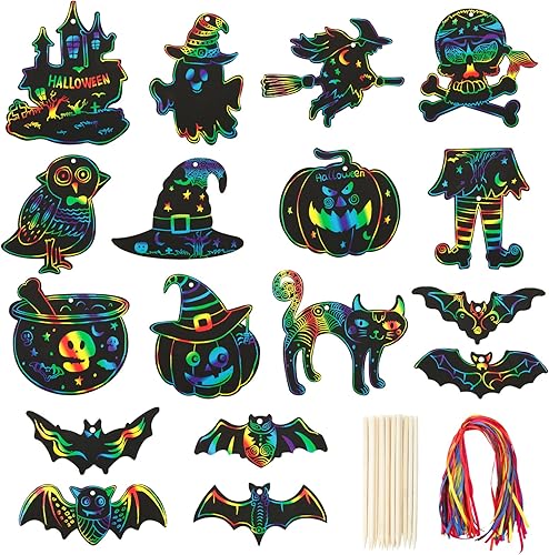 51PCS Dessins Gratter Halloween Scratch Art Artisanat Halloween Bricolage Chauve Souris Fantôme Citrouille Décoration Cadeau Étiquette Jeux Enfant Fête Halloween avec Rubans de Soie et Bâtonnets