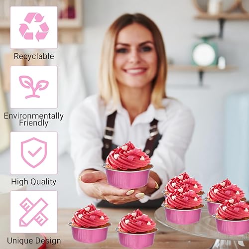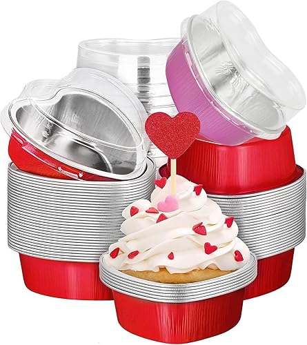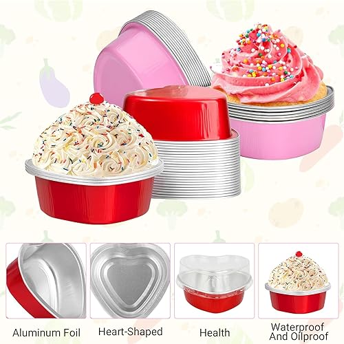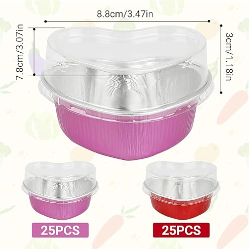 Lot de 50 Moules à Gâteaux en Forme de Cœur avec Couverture, Mini Moule à Pâtisserie Jetable, Caissettes Cupcake en Papier d'Aluminium, pour Saint-Valentin, Mariage, Anniversaire(25 Rose et 25 Rouge)