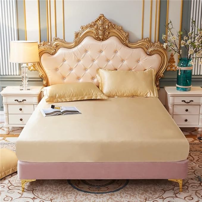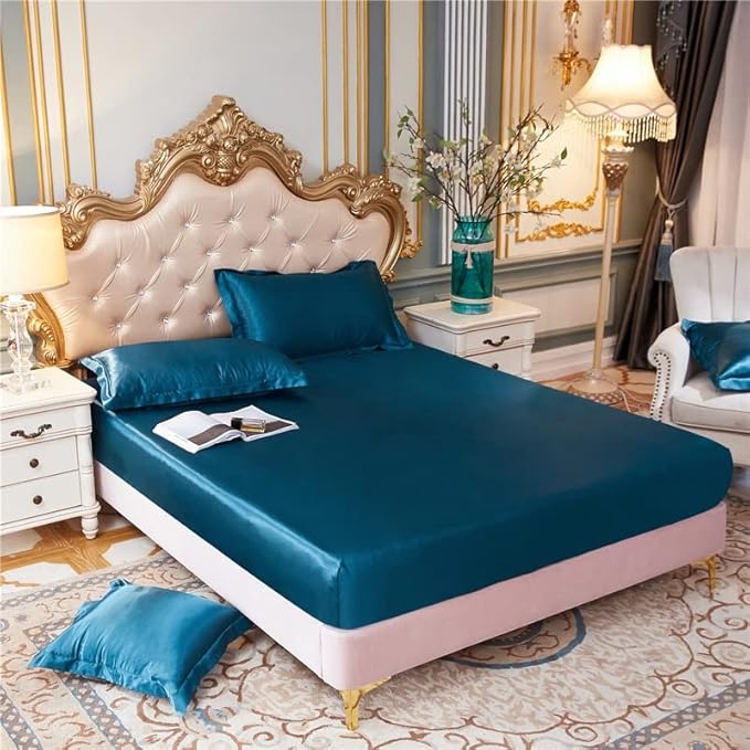 JIALIU Ensemble de draps-Housse de Luxe en Satin de Soie Queen draps et taies d'oreiller Simples Haut de Gamme avec draps à Bande élastique