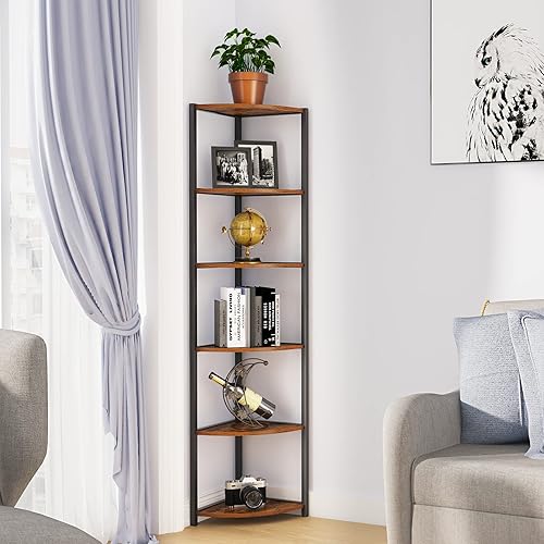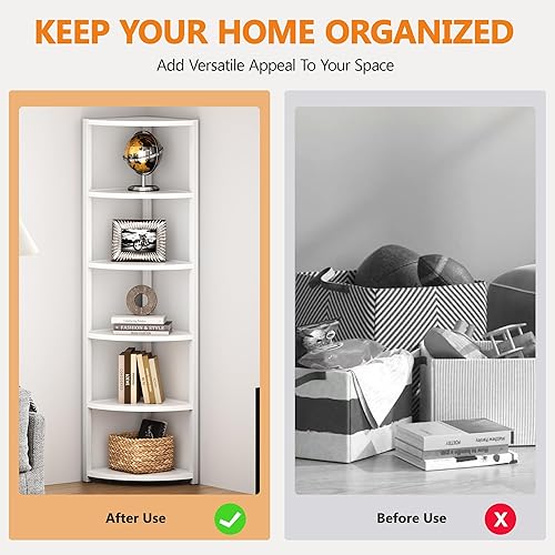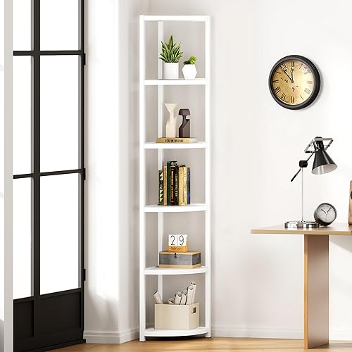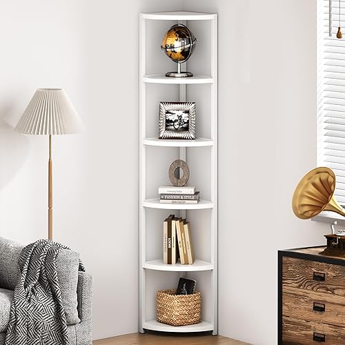 SogesHome Étagère d'angle à 6 Niveaux, Bibliothèque sur Pied pour Coin Étagère de Rangement Industrielle pour Cuisine, Salon, Chambre à Coucher, 34 x 34 x 165 cm, Blanc