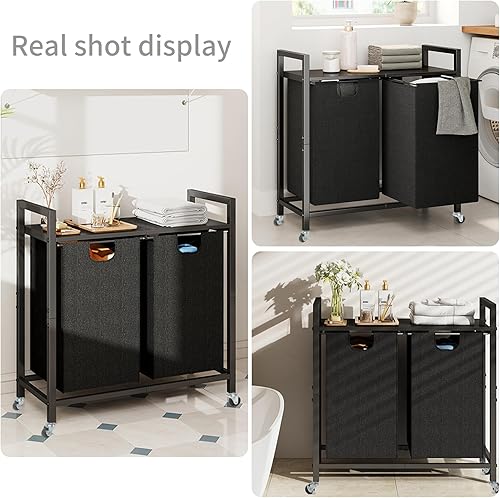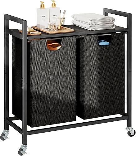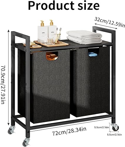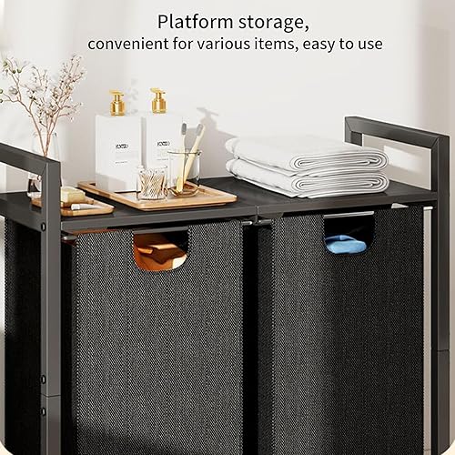 Panier à linge à 2 compartiments, panier à linge avec étagère et sacs à linge amovibles en tissu Oxford, panier à linge extensible avec cadre en métal solide, 2 × 42 l, 72 × 32 × 71 cm (A)