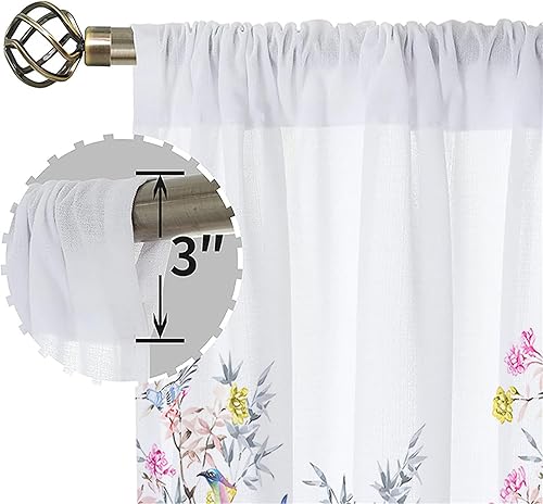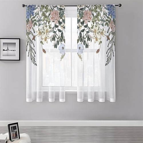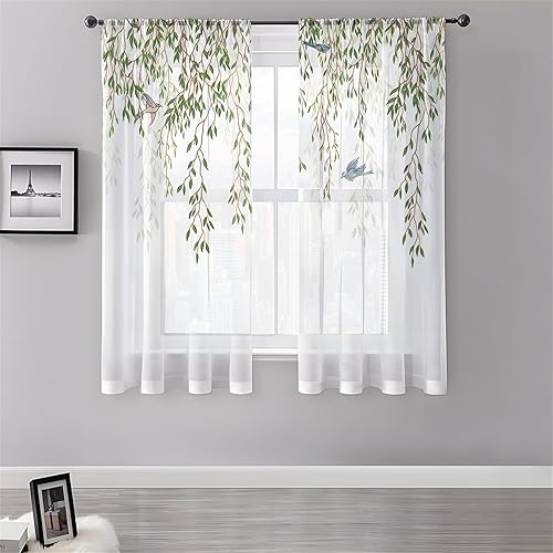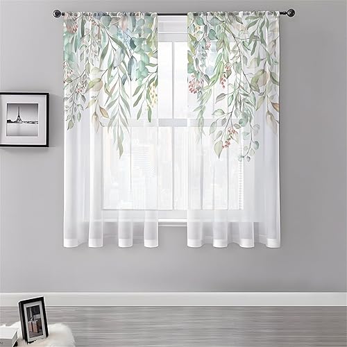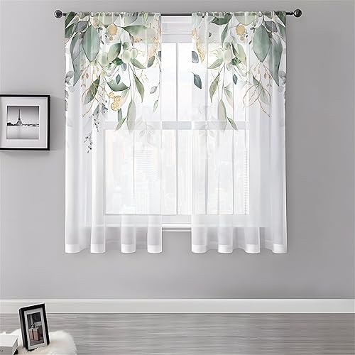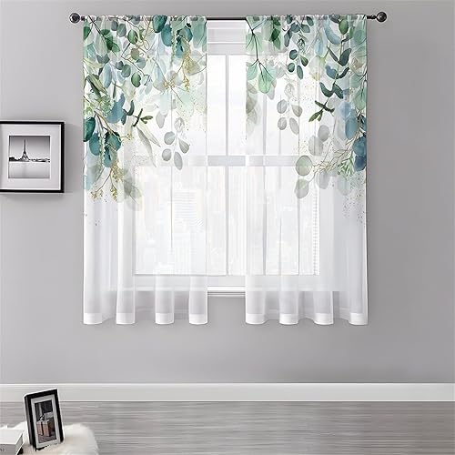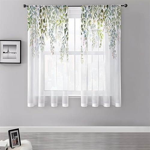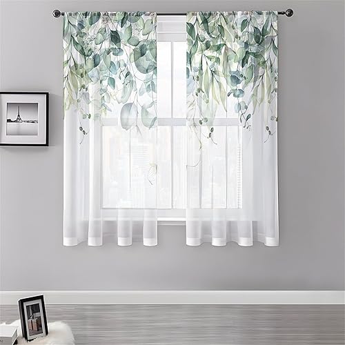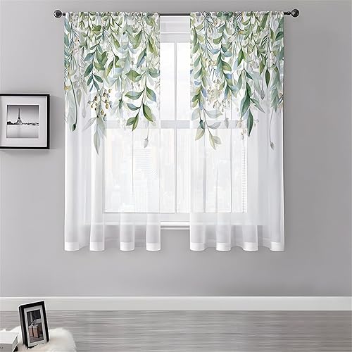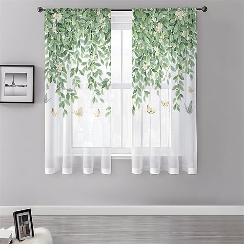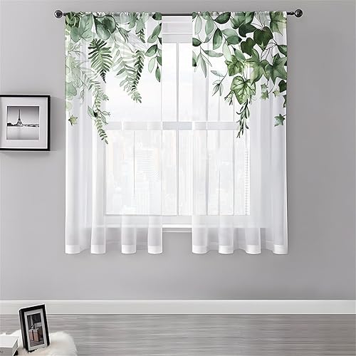 Surwin Lot de 2 Rideau Voilage, Rideaux Voilage, 3D Imprimé Plante Verte Rideau à Oeillets, Transparent Rideaux Salon Moderne pour Décorer Salon, Chambre, Cuisine, Fenêtre (Vert 5,135x45cm)