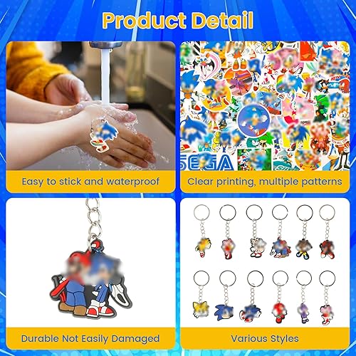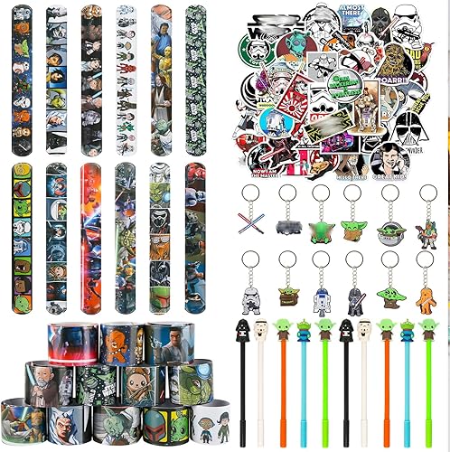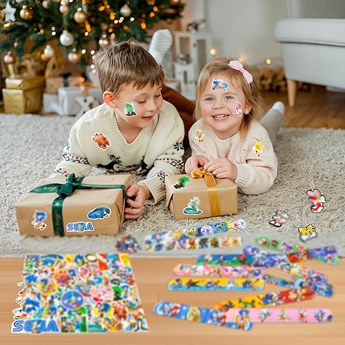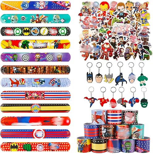 Ainvliya Lot de 74 sacs de fête Soni, 50 autocollants, 12 bandes Slap, 12 porte-clés, fournitures de sacs de fête pour enfants, garçons et filles