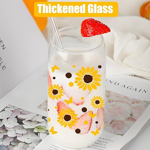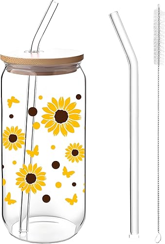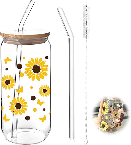 filheraze Verre Avec Couvercle et Paille, Élégant Gobelet en Verre de 16 oz Avec Couvercle et Paille, Beau Motif Chrysanthème, Canette, Polyvalent pour Le Café, Les Cocktails et Plus Encore
