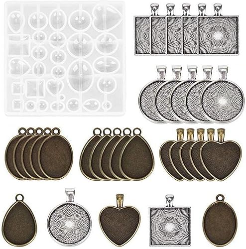0XBIT Plateaux Pendentif, 30 Pièces Plateaux Vierges Suspendus, Métal Pendentifs Lunette avec 1 Moule en Silicone pour Bijoux, Porte-Clés, Fabrication DIY