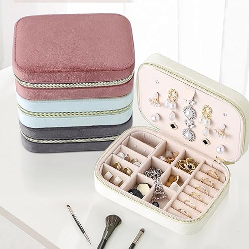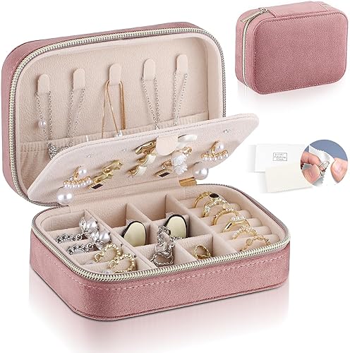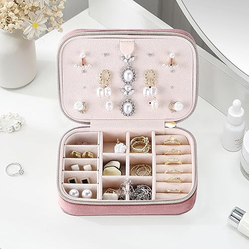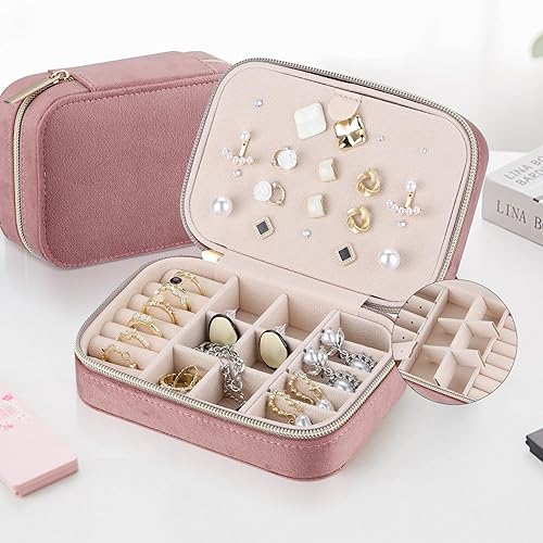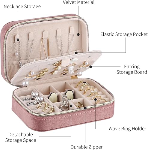 Firelex Boite a Bijoux Voyage en Velours pour Femme,Boite Bague Bijoux Organisateur Mini Coffret à Bijoux Avec Fermeture éclair pour Bagues, Boucles d'oreilles, Colliers(Rose)