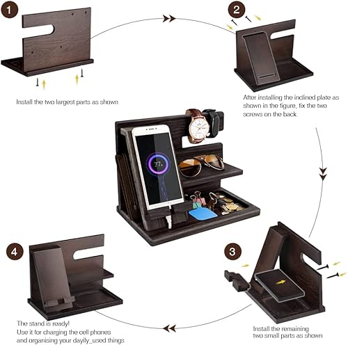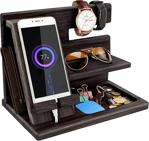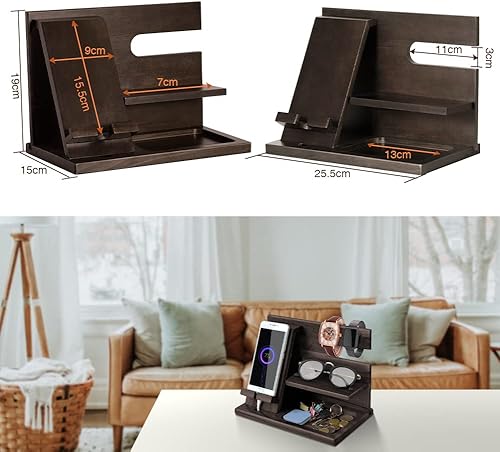 Cadeau Homme Noel Utile Organisateur de Bureau Bois et Station de Recharge Monnaie Montre Support Telephone Bureau Cadeau Noël Homme Original Cadeau Papa Cadeau Anniversaire Homme Cadeaux Homme Femme