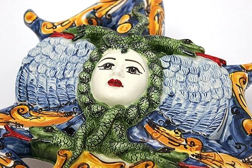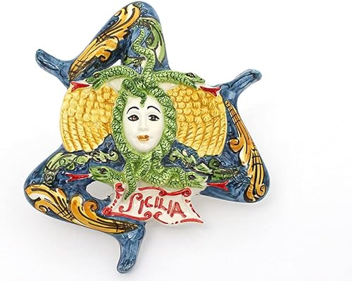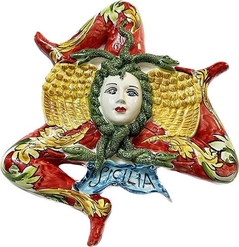 Trinacria en céramique dicilienne de Caltagirone fabriquée à la main, décoration artisanale (rouge, 28 cm)