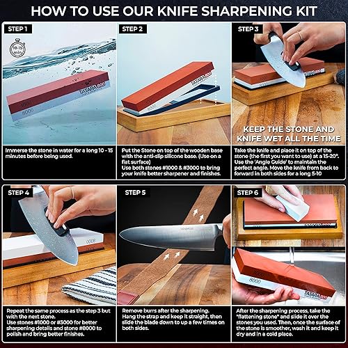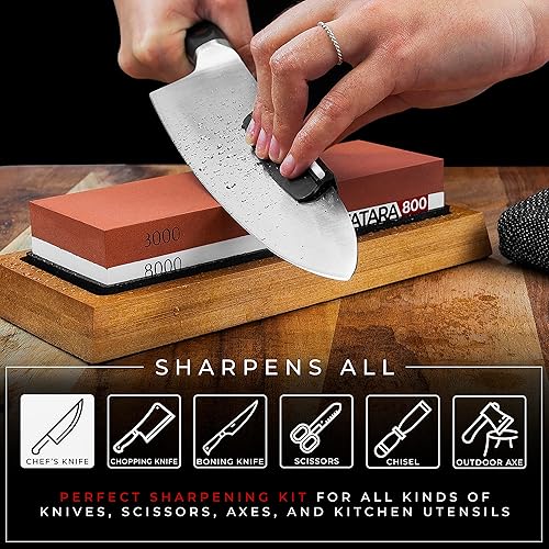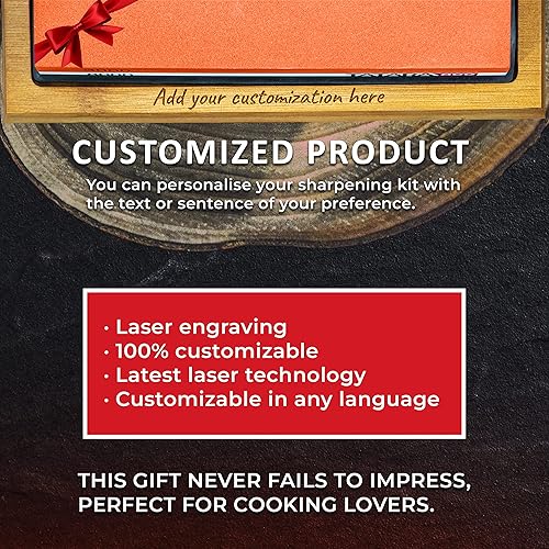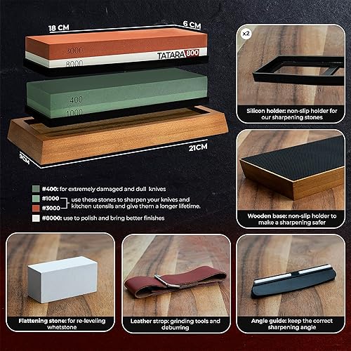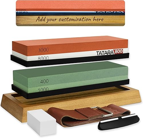 PERSONNALISABLE Pierre à aiguiser couteaux 400/1000 & 3000/8000 - x2 Pierres affûtées, base antidérapante, guide d'affûtage, pierre de polissage, ruban en cuir et boîte cadeau (kit personnalisable)
