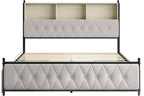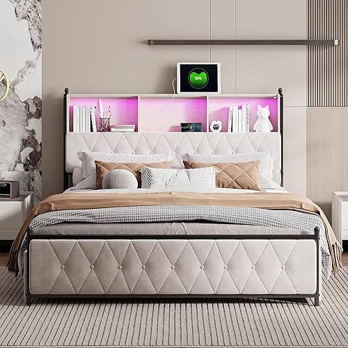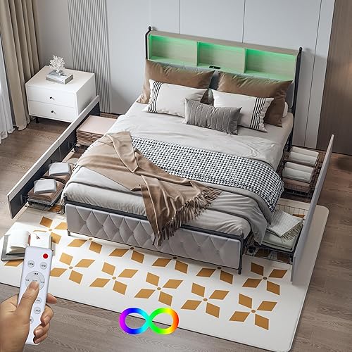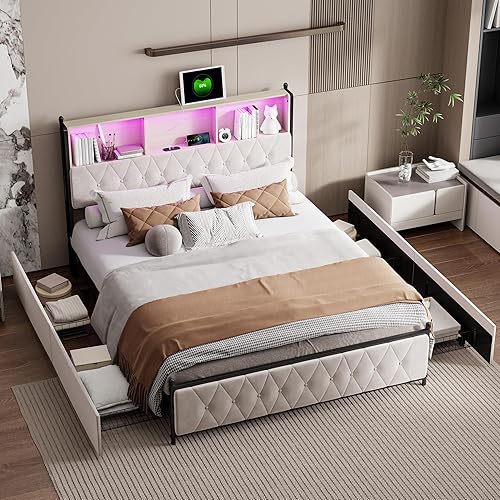 Générique Lit Double Rembourré 140x200 cm avec LED et USB, Lit Adulte à Sommier à Lattes et Tête de Lit de Rangement, avec 4 Tiroirs, Velours Beige (140x200 cm)