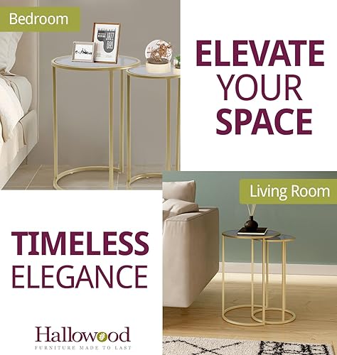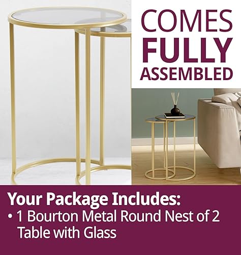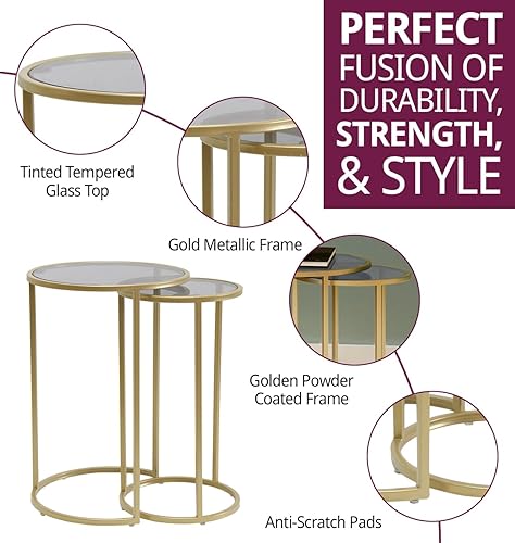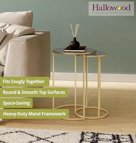 Hallowood Furniture Lot de 2 Tables Gigognes Rondes - Métal Doré, Plateau en Verre Teinté - Pour Salon et Couloir, Basse, Lampe, Plantes