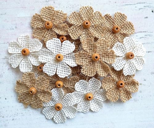 Fleurs en Toile de Jute Artisanal avec Perle 3,5 CM Lot de 18