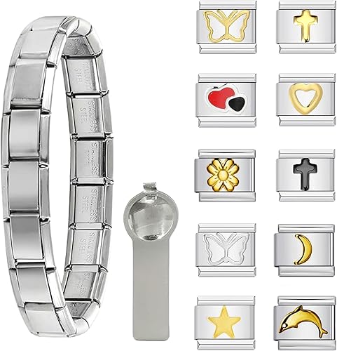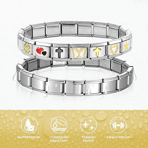 Bzzerumy Lot de 12 bracelets à breloques italiens en acier inoxydable avec détails dorés et argentés