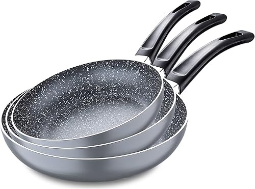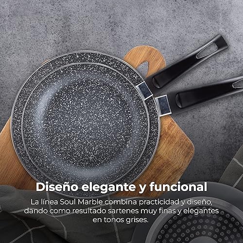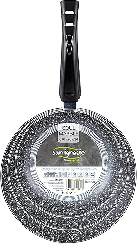 SAN IGNACIO Soul Marble | Set de poêles antiadhésives | 3 pièces de 16, 20 et 24 cm de diamètre | Aluminium pressé | Couleur grise | Pour cuisinières électriques, hallogènes, à gaz et vitrocéramiques