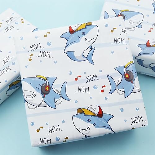 Lot de 4 feuilles de papier cadeau pour bébé garçon et fille, motif requin de dessin animé, 50 x 70 cm par feuille, papier cadeau pour fête prénatale, anniversaire, maternelle, nouveau-né