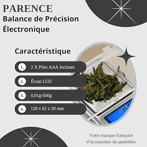 PARENCE.- Balance de Précision Éléctronique 0,01g-500g / 2x Piles AAA Incluses, Écran LCD - Cuisine, Maison - 120 x 62 x 20 mm