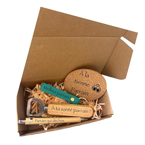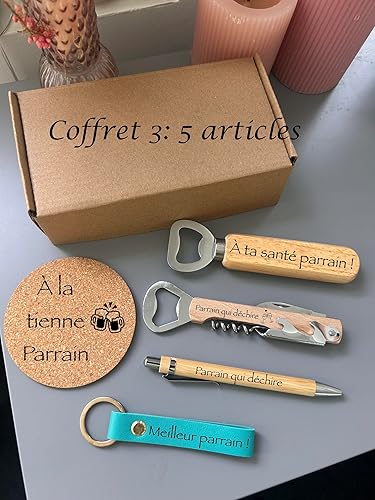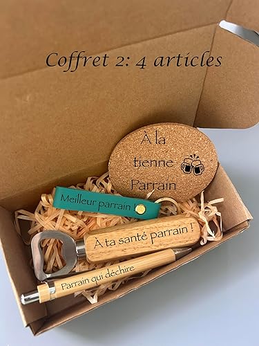 Coffret cadeau personnalisé pour homme - coffret boite kraf- dessous de verre liège personnalisé-ouvre bouteille en bois personnalisé- stylo bambou personnalisé-porte clé cuir personnalisé